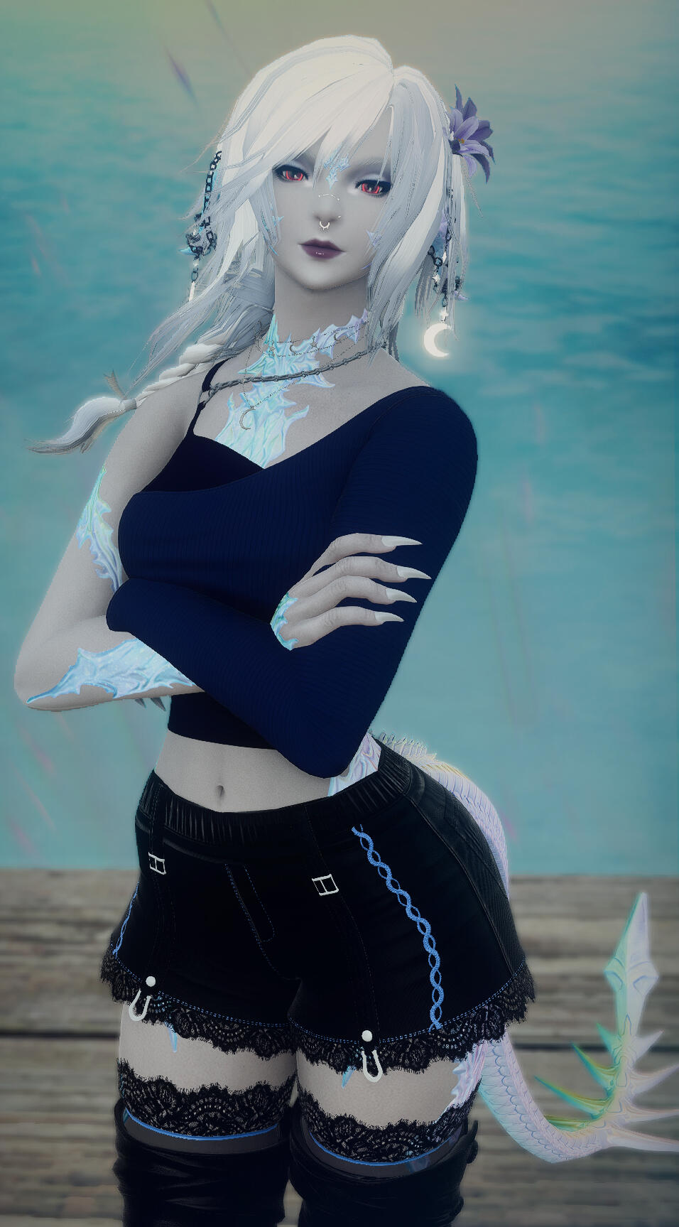 By chance we happened upon a clan of Au’ra, an interesting being, soft skin, mixed with scales, this settlement seemed to have been devastated by the natural disasters and now were on brink of death, hunger and disease rampant among their forms. As they died we used the last of our strength to keep their bodies alive as their souls left them to return to the cycle of rebirth that we had denied ourselves for so long.Once their vessels were empty, we took their form and something strange happened, we used our strength to heal the bodies but when our souls took hold their scales, which had been a dull off white turned brilliant white and shown with the blue iridescence of our moons of Mirthal. We wept in joy for we remembered in that instance that our old forms had scales such as these. Even as Etheirys’s strange moon shed its light and our scales glowed like in days long gone. We felt as if we had been given a reprieve for our mistakes, given this small mercy to be as we once were.