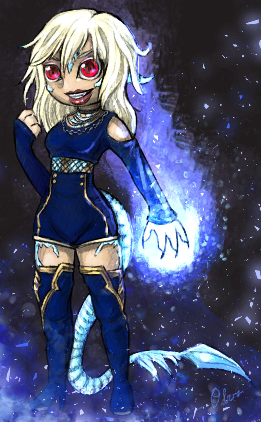 Vulispa's scales gleam a brilliant white with a iridescent blue shine to them. When moonlight hits her scales they emit a soft glow.